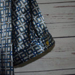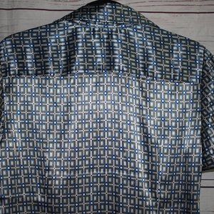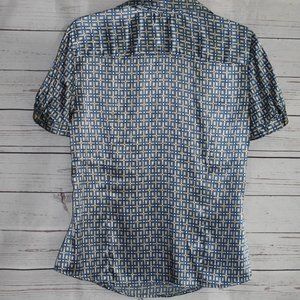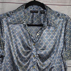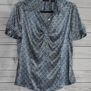 New York & Co short top. Material feels silky. Gathered bodice. Short sleeve with button cuff. Size M. No stains or picks in fabric. Excellent condition!