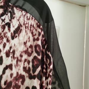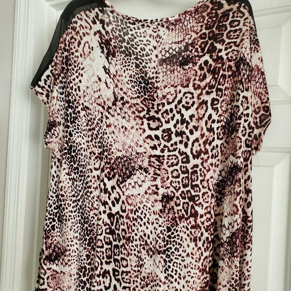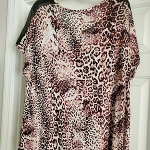 EUC, short sleeve, rayon/polyester blend, 26 inch pit to pit, high/low hemline, 33 inch long.