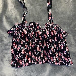 Black cropped tank top that scrunches and has small flowers all over. Runs small