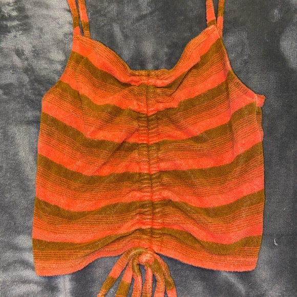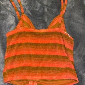 Orange cropped tank top with brown stripped. Thick sweater material and tied in the front