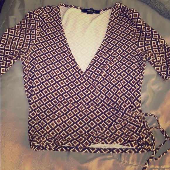 Shortsleeved with blue and orange reddish colors, ties on the side. A lot of cleavage