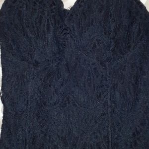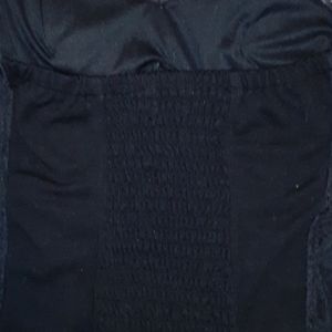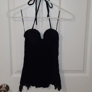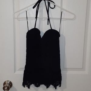 All black halter top. Lace over lay, around the inside of the bra area it has a rubber border to hold up cups. Strecky back.
