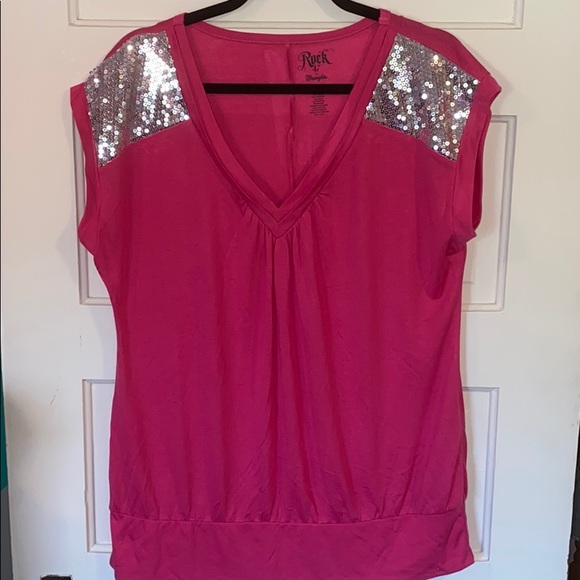 Wrangler Rock 47 short sleeve top. Fuchsia pink with silver sequin detail. V-neck. Great condition barely worn.