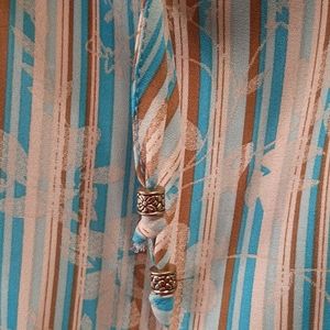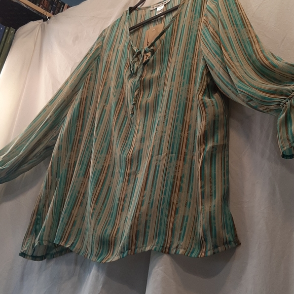 CYDNEY MAR Turquoise, bronze,beige pullover crew neck sheer longsleeve blouse. Pattern has a faint hint of asian flowers. Full feminine and flowing. NWOT