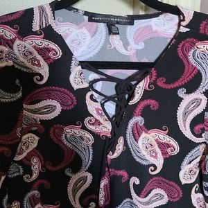 From white house black market its a pasley black wine pink bell sleeves flair bottom