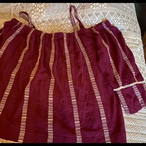 Flowy top burgundy white stripes cold shoulder hits at band on pants