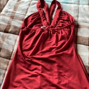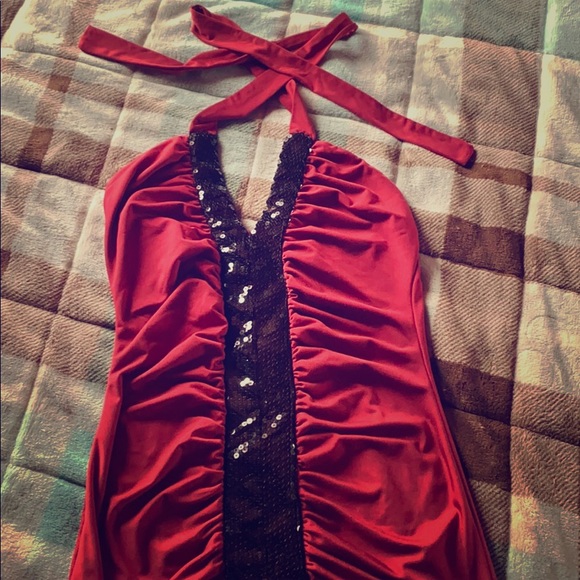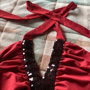 Red halter top wraps to back of neck. Black sequin design in the middle to the bottom .. sexy top