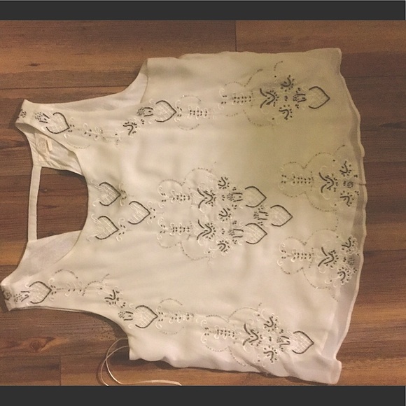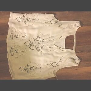 Ivory sleeveless top .the back is a v shape with embellished fabric tying the two sides together. Beading on the front with deep grey, clear color with embroidered design. Polyester/rayon fabric. Elegant over black pants!