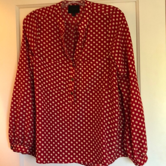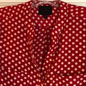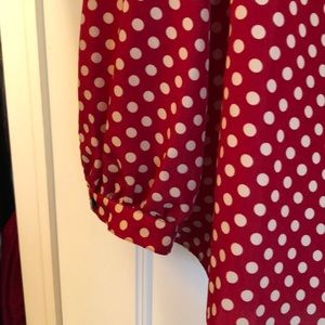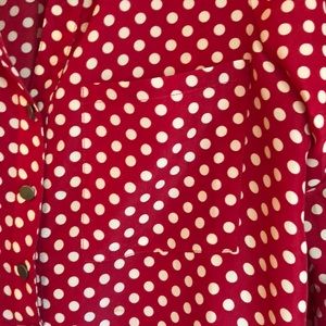 Red/cream dotted 3/4 sleeve blouse, button up front down to waist, 2 front patch pockets, lots of beautiful styling!