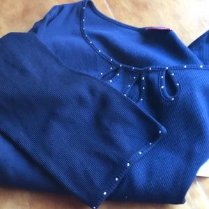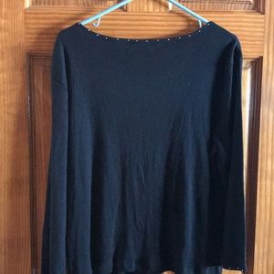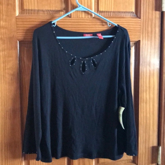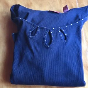Black shirt with rhinestones around the neck and sleeves. 100% cotton with 3/4 length sleeves.