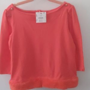 Brand new coral shirt, 3/4 sleeves, golden buttons and faux fur trim.