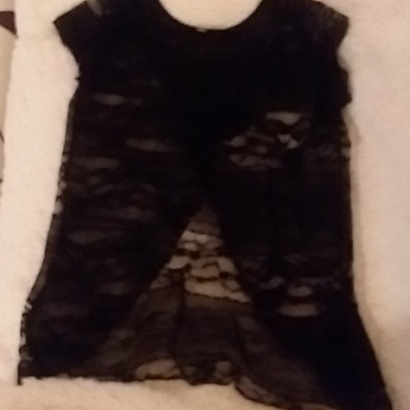 Nwot...black lace short sleeve top. No lining. It criss crosses in back for closing no buttons. Its hard to explain...you must see in person. Would be pretty under a blazer or with a pretty bralett! Perfect for the holidays coming!