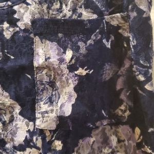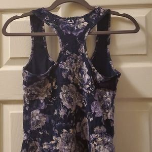 Racer-back lacy floral top. Navy blue with white and light blue flowers and front pocket design.