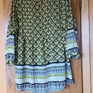 This is a very easy fun top done in geometric patterns in black, yellow, and white. V-neck with buttons for closure and three quarter length sleeves. This top can be worn year round!