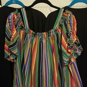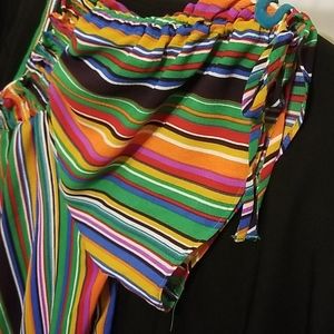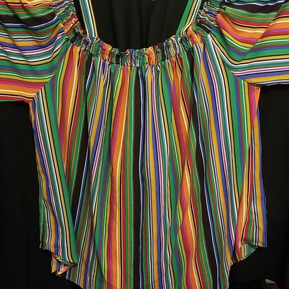 Off the shoulder multicolored top. Size 3x, bright rich colors: kelly green, mustard, red, orange, black, blue, white, and magenta. Absolutely beautiful. 95% polyester, 5% spandex. NWOT