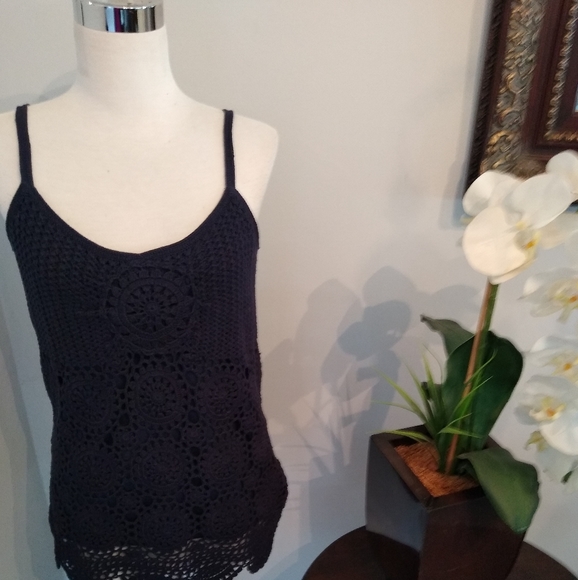 Navy blue crocheted top with spaghetti straps. Hardly worn. Perfect with jeans, pants or a cute skirt.