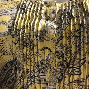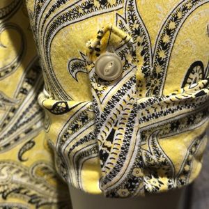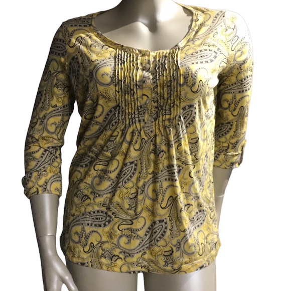 Paisley print top with pleated bodice and button detail. 3/4 length sleeve also features button tabs.