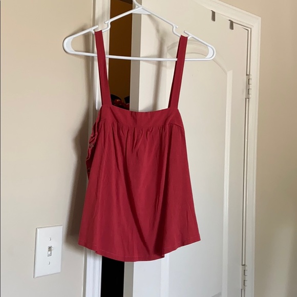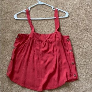 Super flattering top, has buttons on the sides. Goes well w everything. It’s a burnt orange color.
