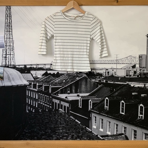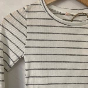Striped stretchy top. 3/4 sleeves. Ribbed. Cropped.
