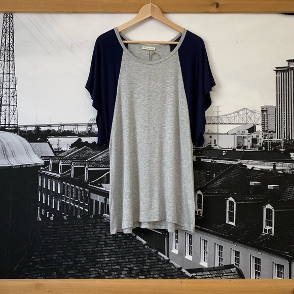 Light flow-y jersey tee. Fun flutter sleeves. Navy & grey.