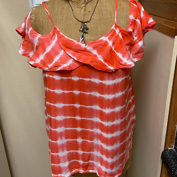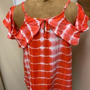Tie dye ruffle front cold shoulder top with keyhole back. 17 1/2 inches pit to pit, pit to Bottom 17 inches, hip 23inches . Machine washable loose fit.
