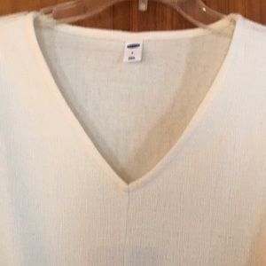 Cream colored, gauzy look but thicker, stretchy material with tie front