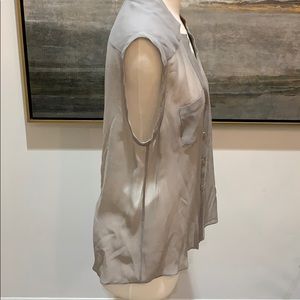 Grey sleeveless blouse with button up front. Sheer/chiffon and two front pockets