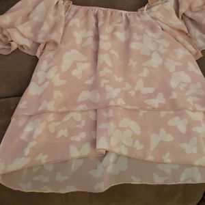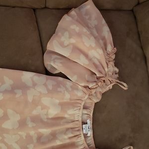 Flouncy pale pink and off white spaghetti strap with cape sleeve top, off the shoulder top, butterfly print