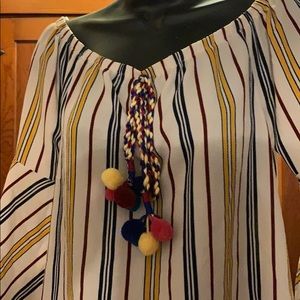 Beige, navy blue, burgundy and yellow striped off the shoulder shirt