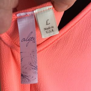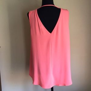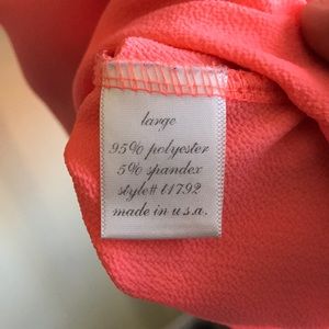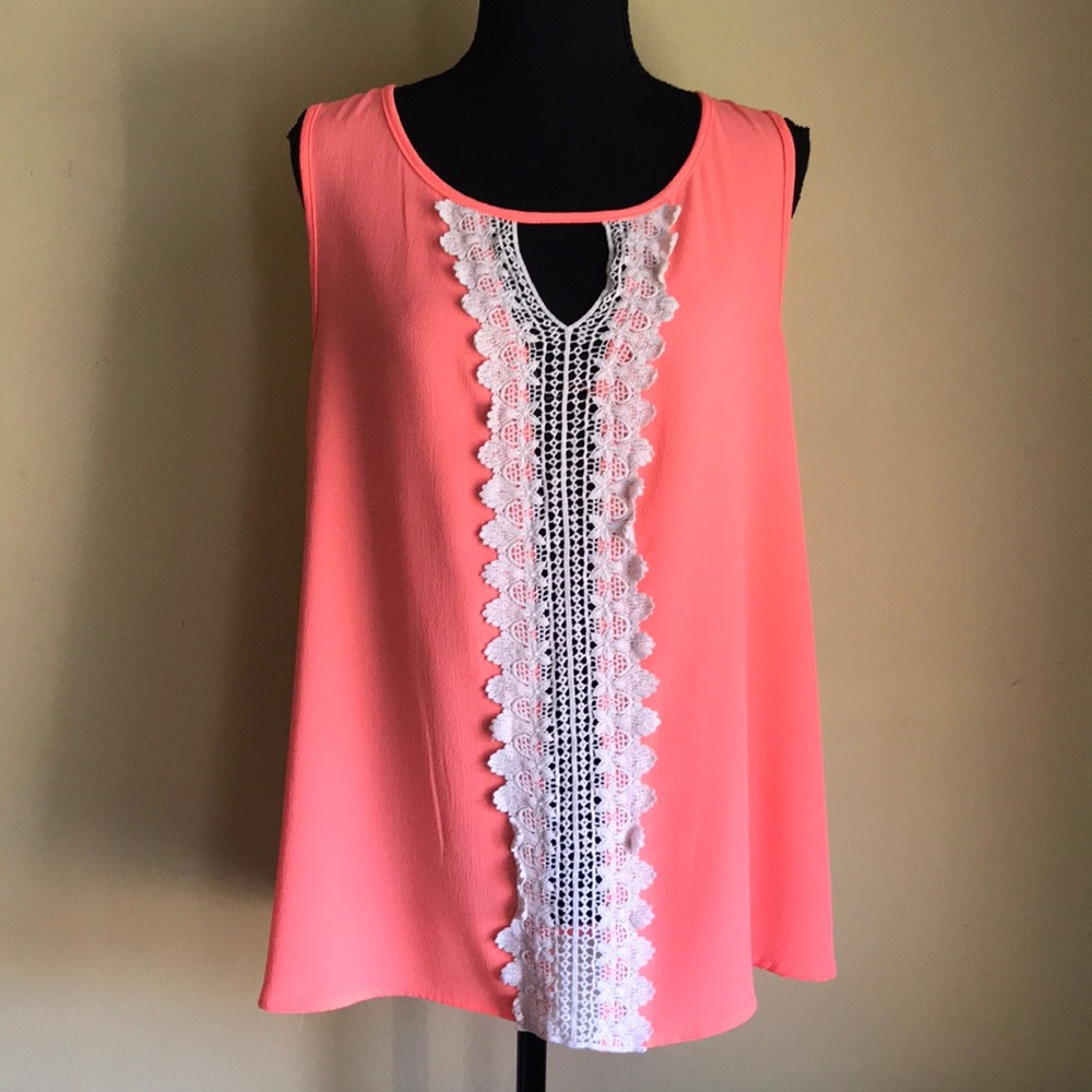This sleeveless top is a size large. The ruffles will lie down if ironed. The color is more of a salmon/coral. The lace section is see-through but does not expose much. Comes from a smoke free home.