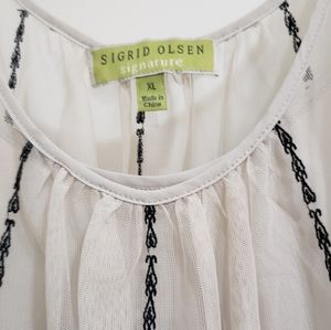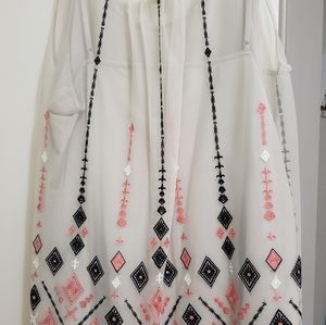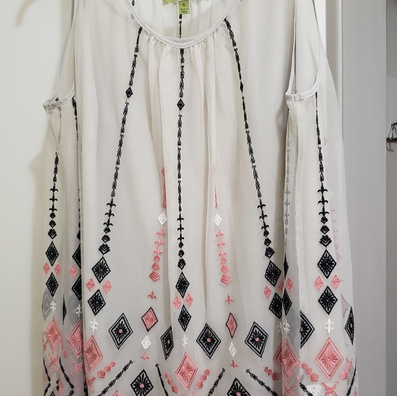 Cream spaghetti strapped camisole with attached embroidered tulle with pink and black geometric shapes