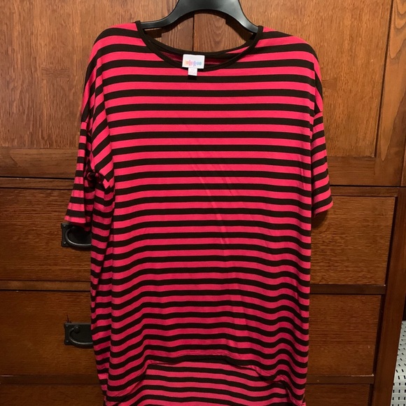 Striped, short sleeve. Cute with leggings or straight leg jeans.