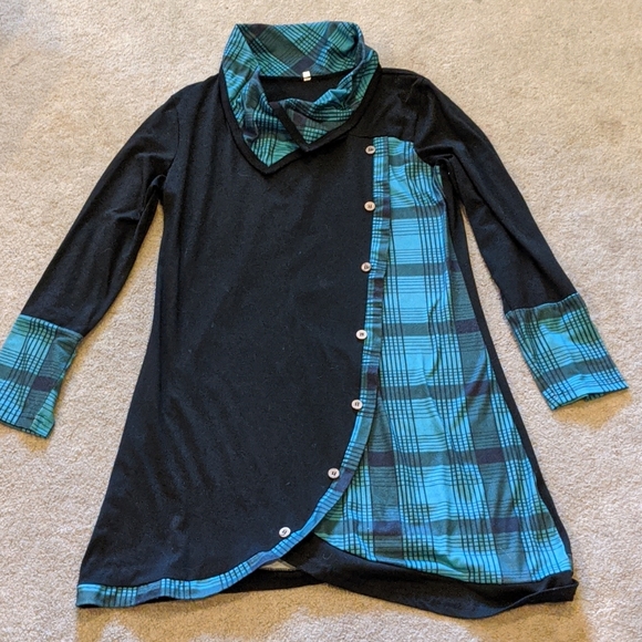 Very comfortable Jersey material tunic top. Beautiful lines with a unique column neck. Great over legends are stretch pants.
