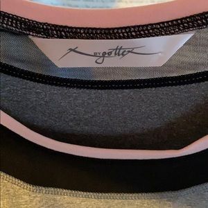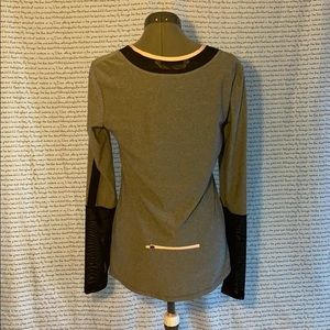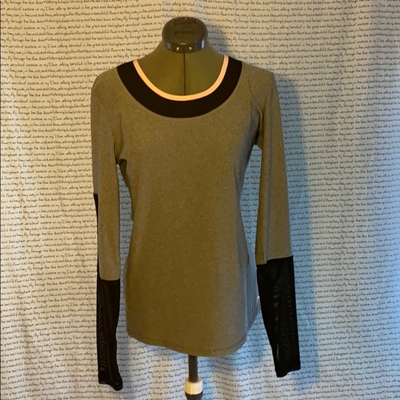 Polyester spandex top Black sheer around the neckline and the lower half‘s of the sleeve The sleeves have a thumb hole