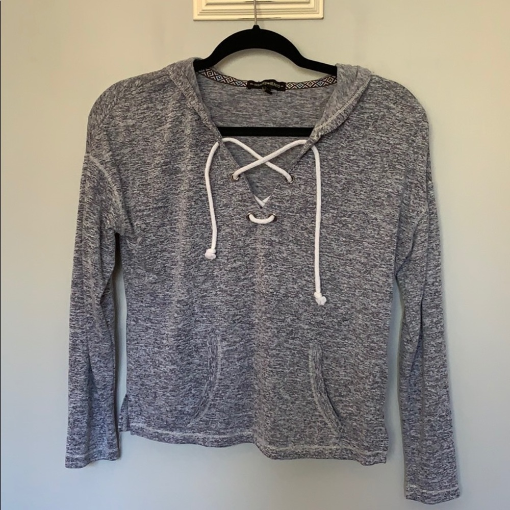 Heather blue athleisure hooded top with lace-up neckline