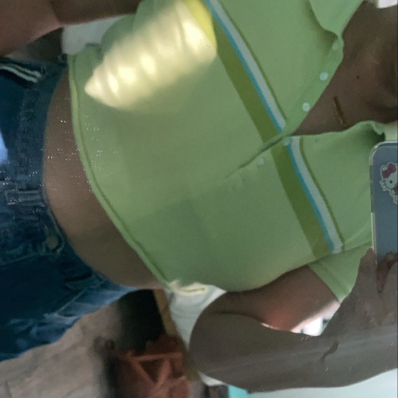 Lime green pollo with blu and white strips through the middle