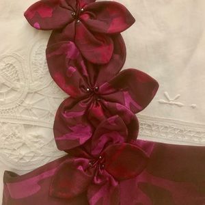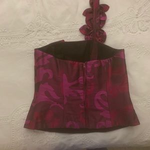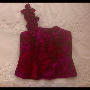 Beautiful floral brocade one shoulder with flower appliqués. Fully lined and boned for extra strength and body. Zippered back. This is a stunning piece. Burgundy, pink and red. Check out the listing for matching skirt.