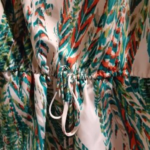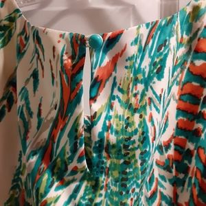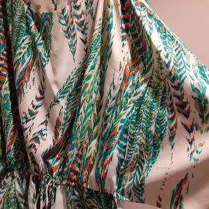 Green/cream/rust top by Eci--button closure in back--bat wing open sleeves--ties at waist.