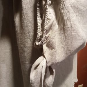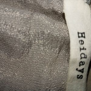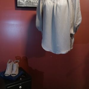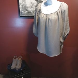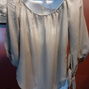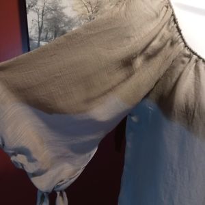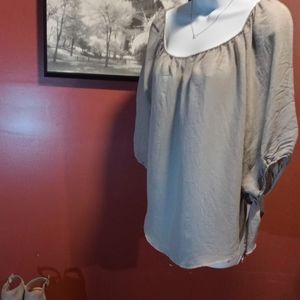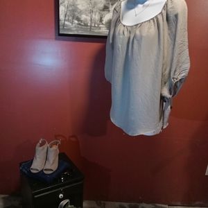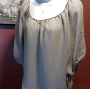 Heidays brand belle sleeve top. This top is a light grey with greenish hue. The sleeves are 3/4 with elastic cuff and winged ties that can be worn tied or untied as pictured. Excellent used condition. Perfect with jeans for a casual day or paired with some black slacks to dress it up👛.