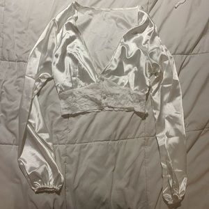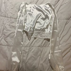 Long sleeve lace button up deep v silk satin material top super cute and fashionable missing tags but size medium. Nasty Gal x Emrata collab in white