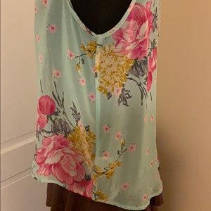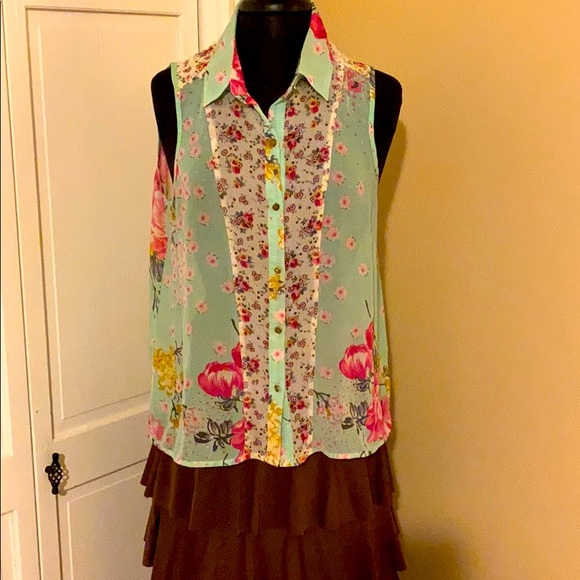 Sleeveless button up top with collar and cutout upper back. Mint Green and bright pink. Some gold/mustard color too. Kinda sheer fabric. Fit my daughter that wears a med/ large.