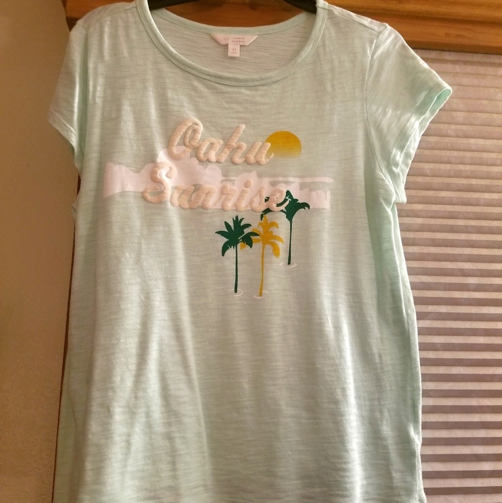 100% cotton loose fit with cap sleeves. The color is light mint green. It has only been worn a couple times. It is very good condition.