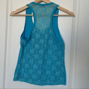 Sleeves top, blue, lace back. size unknown but fits like s/xs.