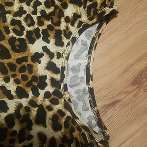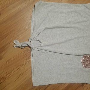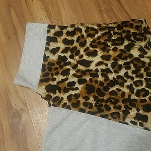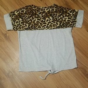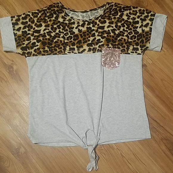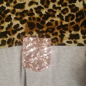 This is a really fun top with its leopard in sert and rose gold sequined pocket. Tying at the bottom. Very stylish with denim. I got this at a boutique. Very soft. Worn twice! It doesn't say what it is made of but I'm guessing a soft brushes light gray cotton t shirt material.