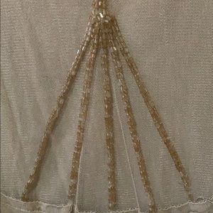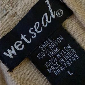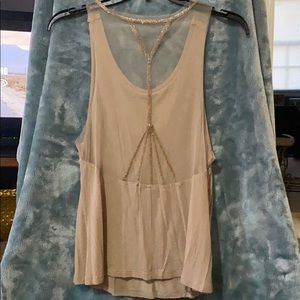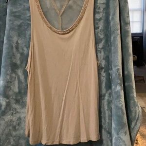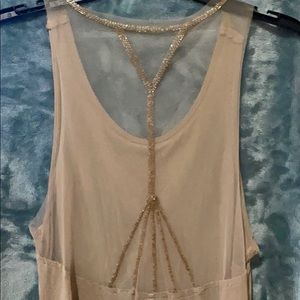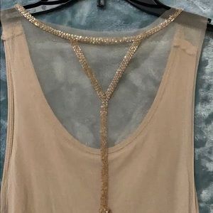 A tank shell this is made by Wet Seal in a Large. A nude cami would probably be be what ya need but I’m sure a nude sexy bra would work also underneath this sheer, in the back, shell. This is a very feminine and a very delicate top. Not a single snag, rips, tear, hole, no missing sequins or stains! Perfect condition and it sparkles so beautifully from across a room with the design of how the sequins are sewn on.