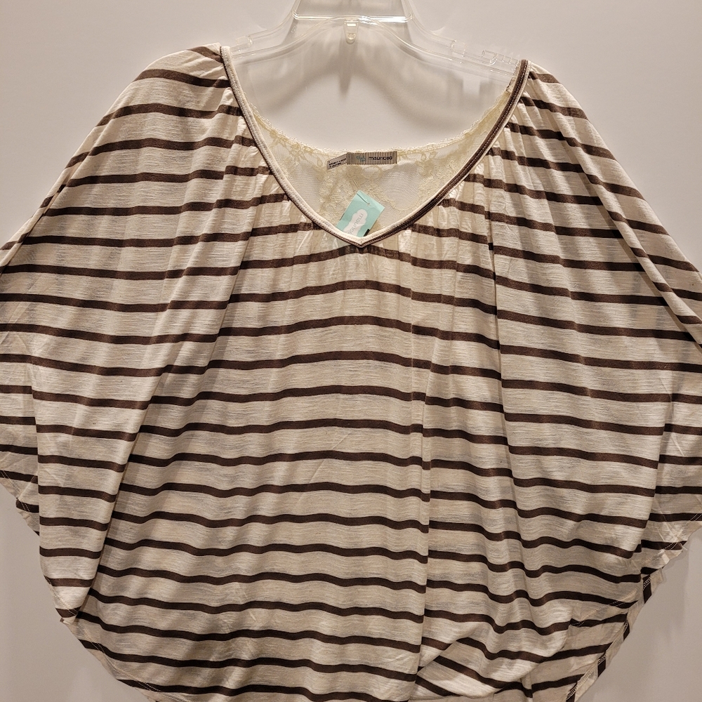 Maurices top, cream with brown stripes with super cute lace detail on back. Size 2, quarter length sleeves, never worn still has tags. The best way to describe the fit is poncho.