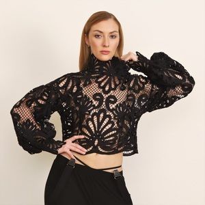 Brand new and Sexy Lace Hollow Out Short Blouse Casual Lantern Long Sleeve Stand Collar Shirts Female Elegant black Loose Tops 2021
