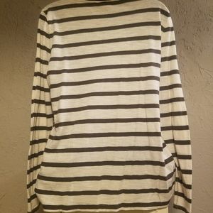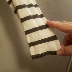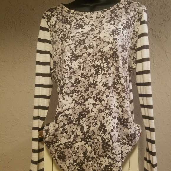 This is a cute top made of 100 % cotton. It is brown floral on the front with stripped sleeves and back. The neck is scooped. It is lightweight and looks great paired with your favorite jeans