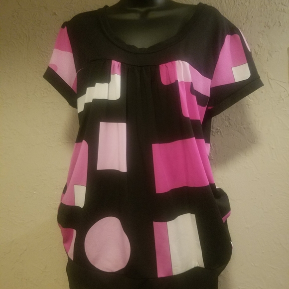 Add a pop of color to those favorite black leggings with this hot pink, light pink and black top made of polyester/spandex. It has a gathered front with a scoop neckline