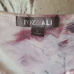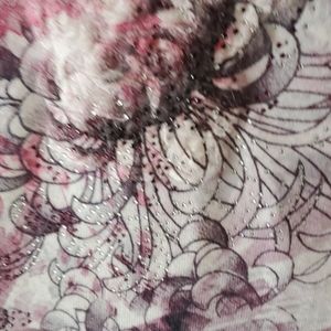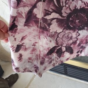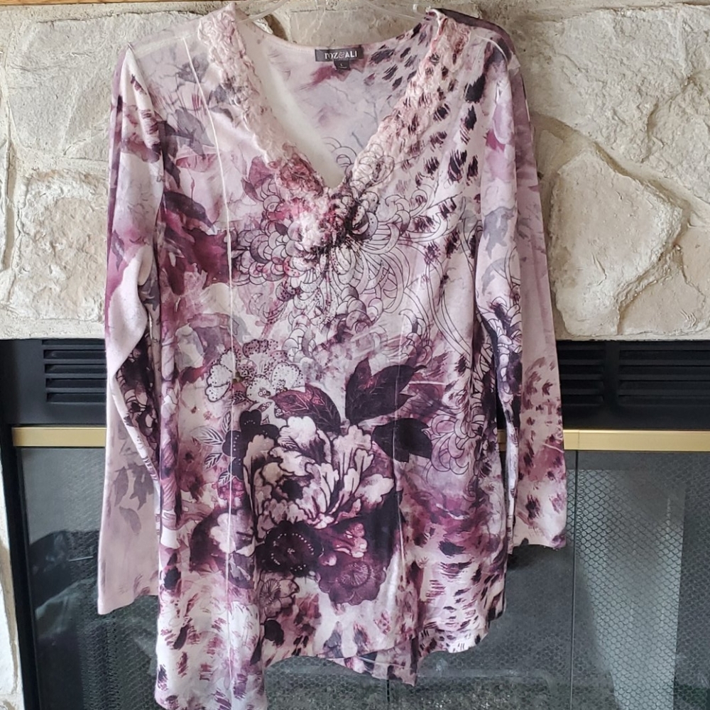 Shades of deep purple to faded lilac and shades of gray. Detailed with a little sparkle from v of neck down midway of shirt. Approximately 31 inches shoulder to hem. Comes to a point on front right and back left. Has a nice fitted appearance to not be so billowy, but yet hangs nicely. It's a large, but not tight. A little on the loose side. Measures 21.5 inches pit to pit. Worn maybe 4 times